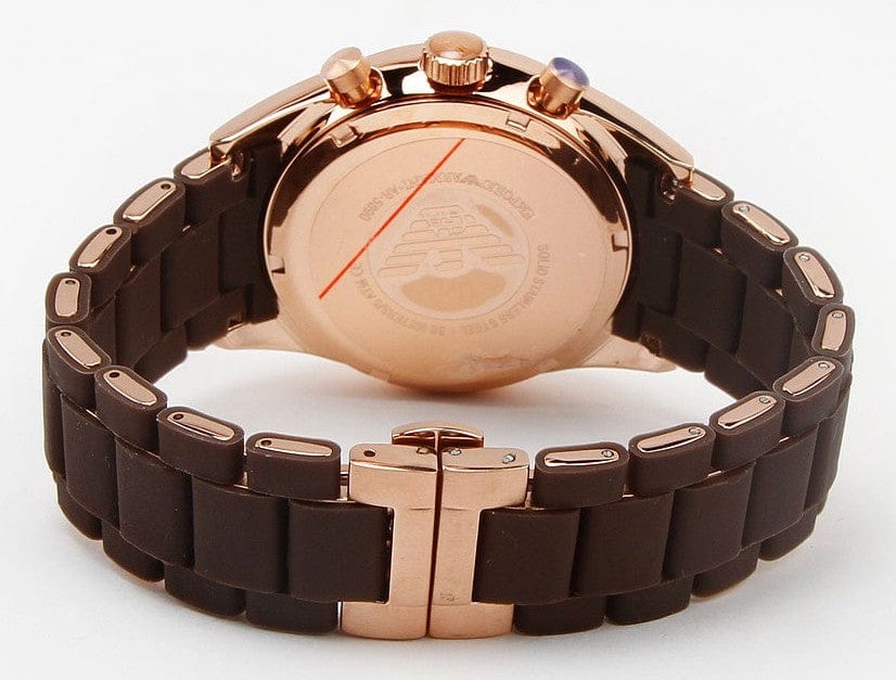Chronograph - three sub-dials displaying: 60 seconds, 60 minutes and 24 hours. Quartz movement. Scratch resistant mineral crystal. Solid case back. Case diameter: 38 mm. Case thickness: 10 mm. Deployment clasp. Water resistant at 50 meters / 165 feet. Emporio Armani Sport Rose Gold Ion-Plating Brown Chronograph Dial Men's Watch AR5891.