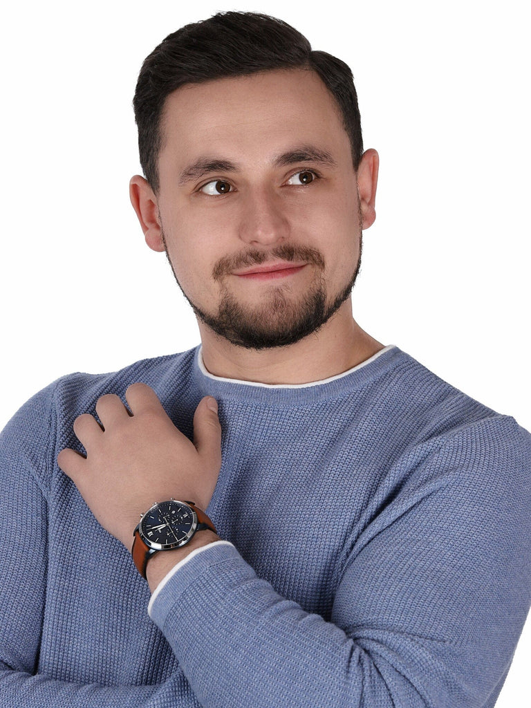 Fossil FS-5791 Neutra Leather Band Men Watch. The case is made out of blue stainless steel with a silver bezel, which stands for the high quality of the item, it has a blue color dial. This model has got 50 meters of water resistance. it can be worn in scenarios where it is likely to be splashed but not immersed in water and will be fine in rain. The watch is shipped with an original box and a guarantee from the manufacturer.