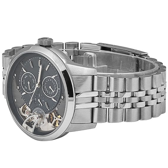 Stainless steel case with a stainless steel bracelet. Fixed stainless steel bezel. Black dial (with skeletal display) with silver-tone hands and index hour markers. Minute markers around the outer rim. Dial Type: Analog. Date display at the 6 o'clock position. Seconds sub-dial. Three multi-functiopn sub-dials displaying: day of the week, date and 24 hours.