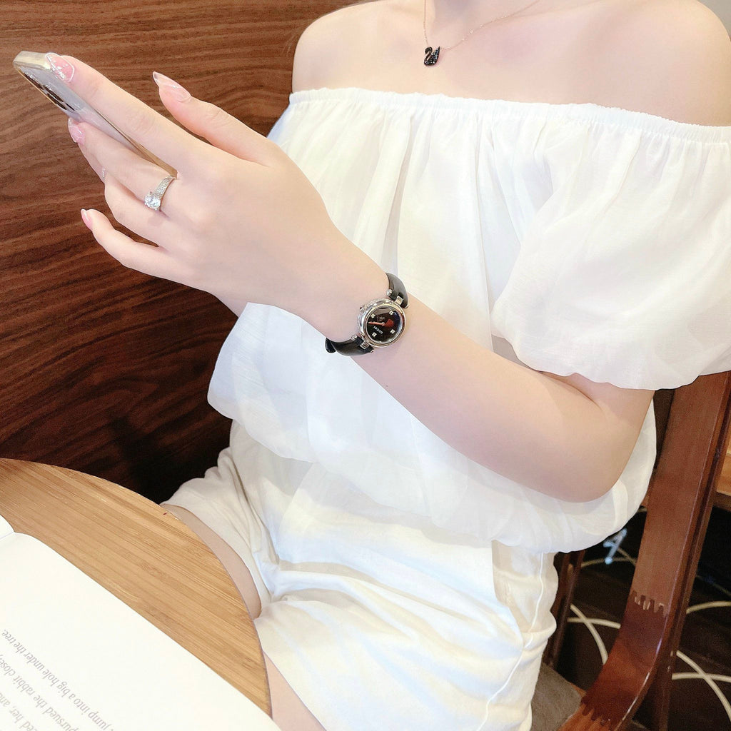 The Diamantissima watch features the signature Diamante pattern etched into the case. The tonal motif lends a delicate finish to the steel case, contrasted with a black leather strap.