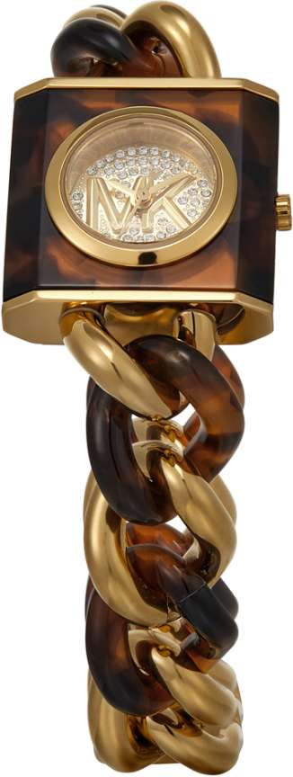 Michael Kors' 25mm MK Chain Lock watch features a gold pavé dial, three-hand movement and tortoise and gold-tone stainless steel bracelet.