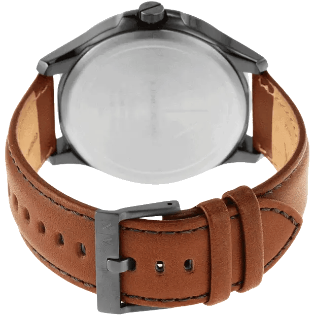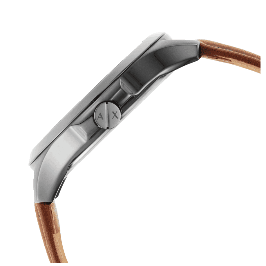 Wear the ultimate expression of Armani Exchange style and design evolution on your wrist with the Hampton series watch. This analog watch features a gray sunray dial with gunmetal stick indexes and a date window for the day of the month, three-hand movement and brown leather strap to finish the look. Also, this polished brown-tone stainless steel watch brings both functionality and style to the table.