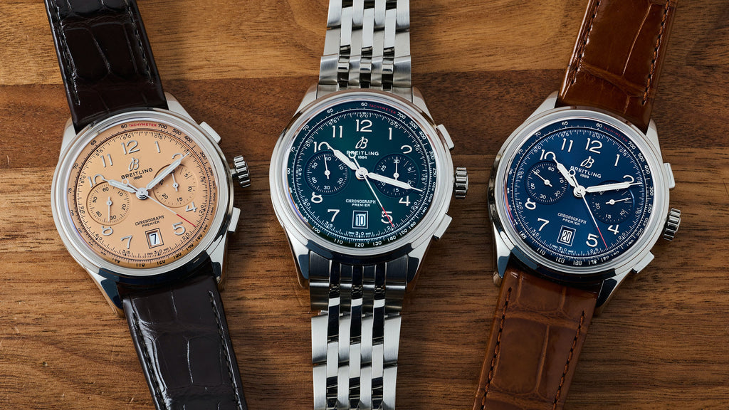 To create its modern Premier, Breitling preserved distinctive vintage-Premier details, including the smooth fixed bezel, twin-register dial, streamlined rectangular pushers and applied Arabic numerals. The Premier B01 Chronograph 42 is available in an array of dial colors and case materials. It comes on a choice of classic alligator leather strap or sleek 7-row metal bracelet. Today’s Premier also lives up to Willy Breitling’s uncompromising technical standards with its exceptional self-winding movement the COSC-certified Breitling Manufacture Caliber 01-designed for maximum precision, reliability and functionality.