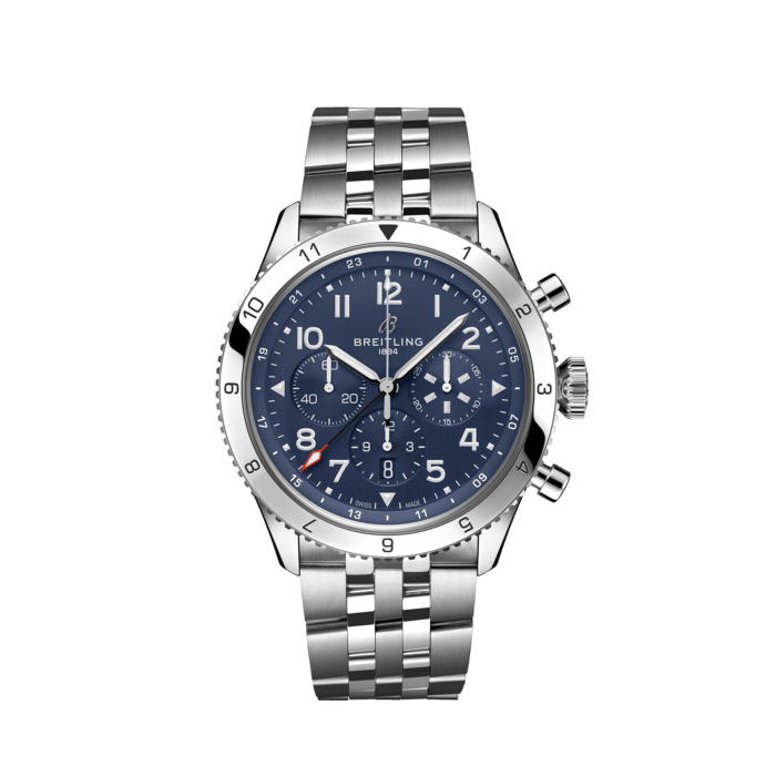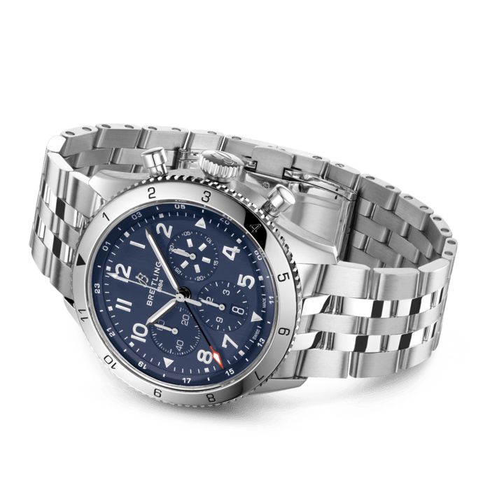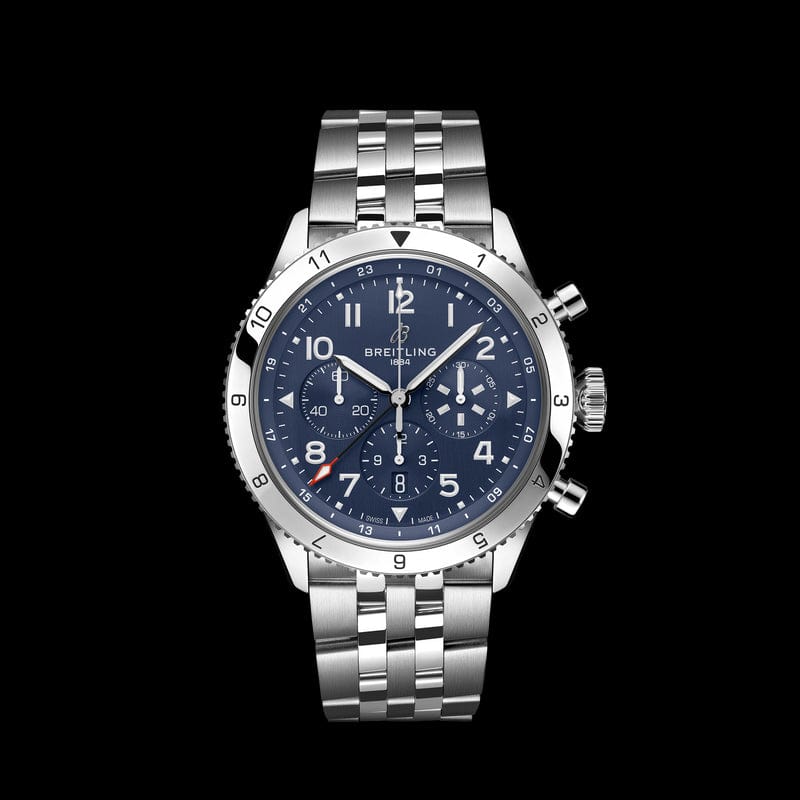 As a WWII naval aircraft, the Corsair had to make tricky takeoffs and landings from carriers and remote landing strips. Speed and lift were of the essence, and the plane came through with flying colors, becoming the first single-engine fighter to crack the 400 mph (640 km/h) mark, while also providing an exceptional rate of climb. Its “bent-wing” design, oversized propeller and signature blue livery make it an emblem of aviation history. As a true pilot’s watch designed to withstand the rigors of a vintage cockpit, the Super AVI Tribute to Vought F4U Corsair features large, highly legible Arabic numerals on the dial and bezel. The oversized crown and knurled bezel on its sturdy 46mm case provide optimal grip, even in a pilot’s gloved hands. Top-stitched calfskin straps give a nod to the seams found on classic flight gear, while the optional stainless-steel bracelet provides an elegant alternative. Pilots and other travelers will appreciate the ability to track a second time zone using the 24-hour marking on the inner bezel and the red-tipped GMT hand. The engine of the Super AVI is the COSC-certified Breitling Manufacture Caliber B04 movement, which provides approximately 70-hours of power reserve.