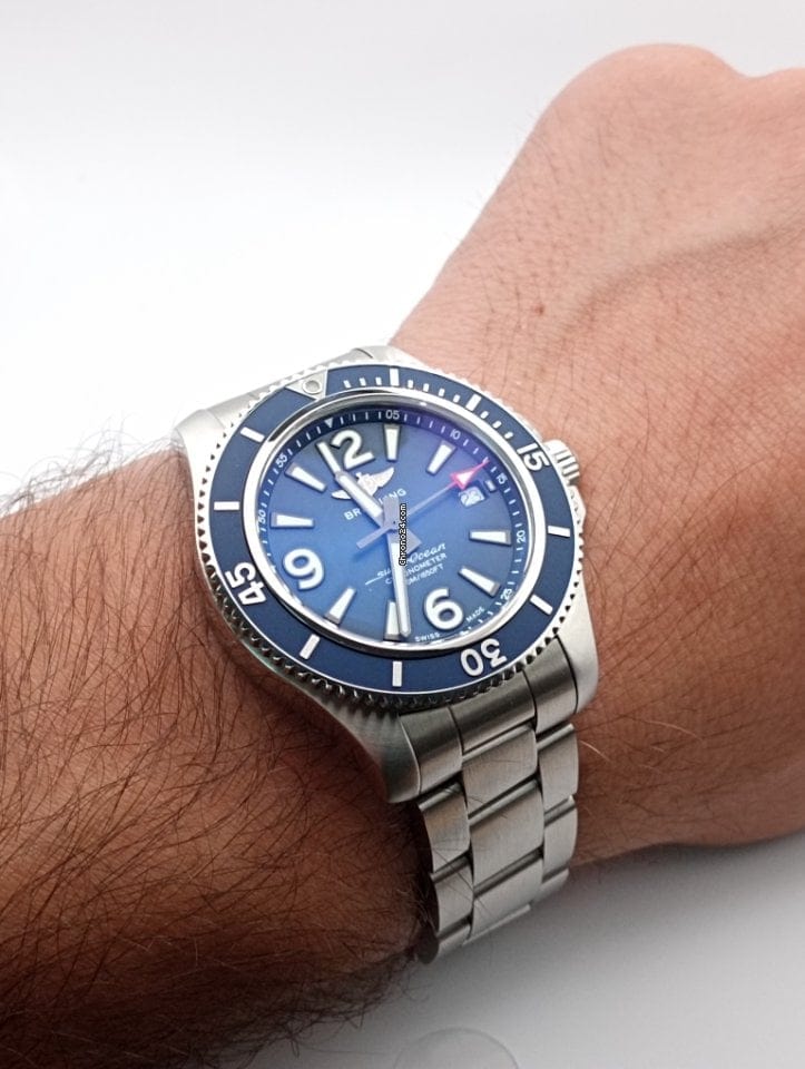 42.00 mm steel case, 13.30 mm thick, screw-locked crown with two gaskets, unidirectional ratcheted bezel, cambered sapphire crystal with glareproof treatment on both sides, blue dial, Breitling 17 self-winding movement, approximately approx. 38 hrs of power reserve, steel and satin bracelet. Water resistant to 500 m (1,650 ft).