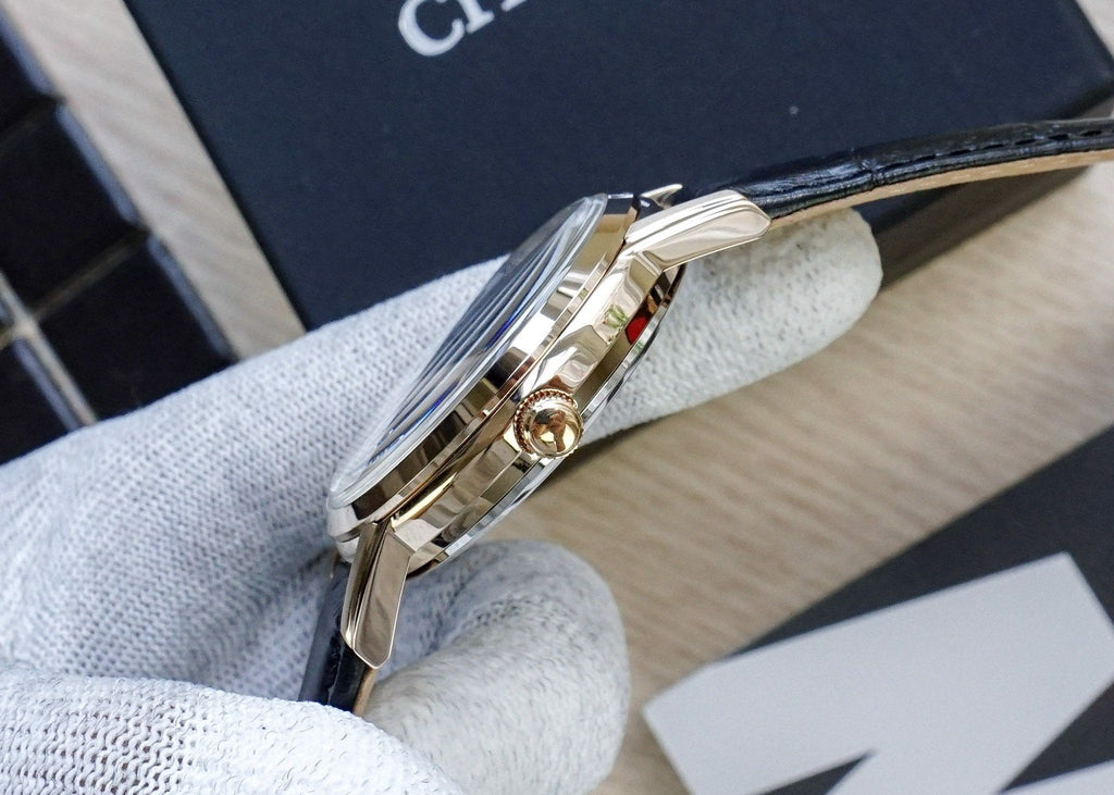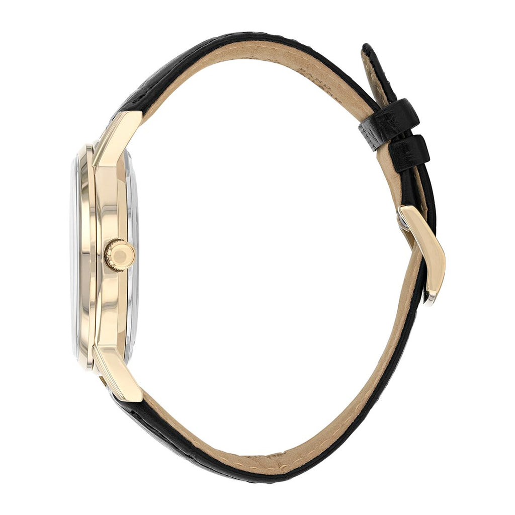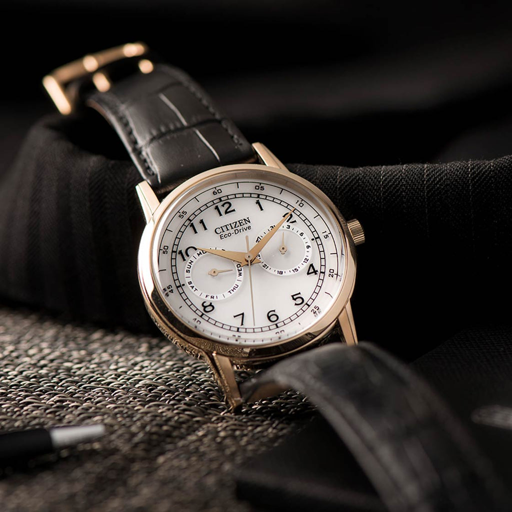 The Day and Date sub-dials overpowers all other features while the rose gold hands add a pinch of flair to the overall aura of this Citizen Eco-Drive calendar watch. The watch is fitted with Plush genuine leather and comes in three different dial color and leather straps. Powered by Eco-Drive- the revolutionary light powered movement from Citizen, this watch has the ability to continuously recharge in any light source and can run for a minimum of six months even in the dark without any charge.