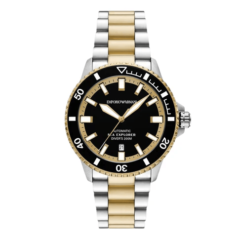 - Emporio Armani's Sea Explorer is a 42.5mm automatic dive watch featuring sapphire crystal and Super-LumiNova on hands, indexes and bezel markings for optimal visibility in dark underwater conditions. As indicated by the "Diver's" marking on the dial, this watch is ISO 6425 certified, making it expertly equipped for deep-sea diving up to 200 meters. This iteration boasts a glossy black enamel dial and an integrated two-tone stainless steel bracelet.