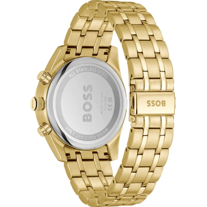 The BOSS Skytraveller 1514152 is a remarkable timepiece that combines bold design and practical features. Featuring a 44 mm diameter, this watch makes a powerful statement on the wrist. The dark dial contrasts beautifully with the gold-colored case and bezel, giving it a striking appearance. Equipped with three subdials, the watch face offers a layer of complexity and functionality. The watch operates with quartz movement driven by the Seiko VD51 caliber.