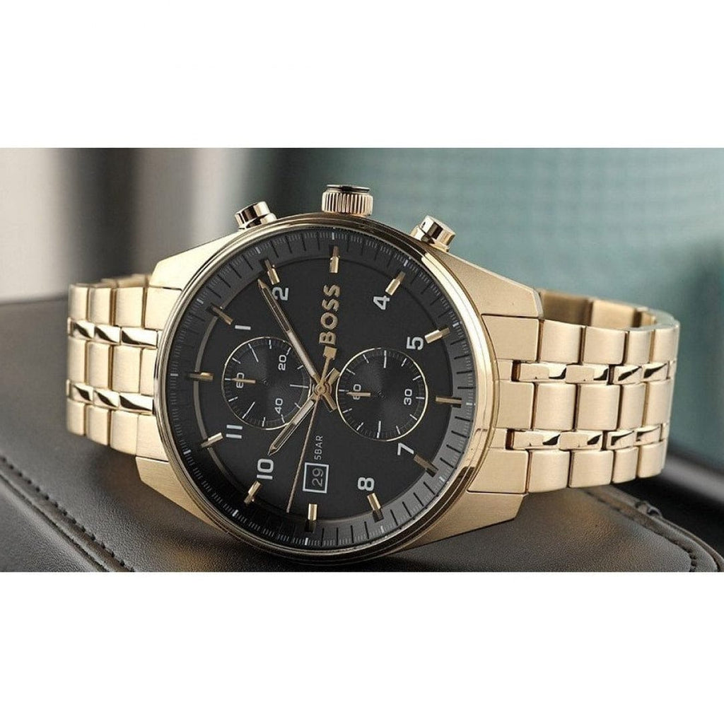 Hugo Boss Skytraveller Chronograph Black Dial Gold Steel Strap Watch for Men - 1514152