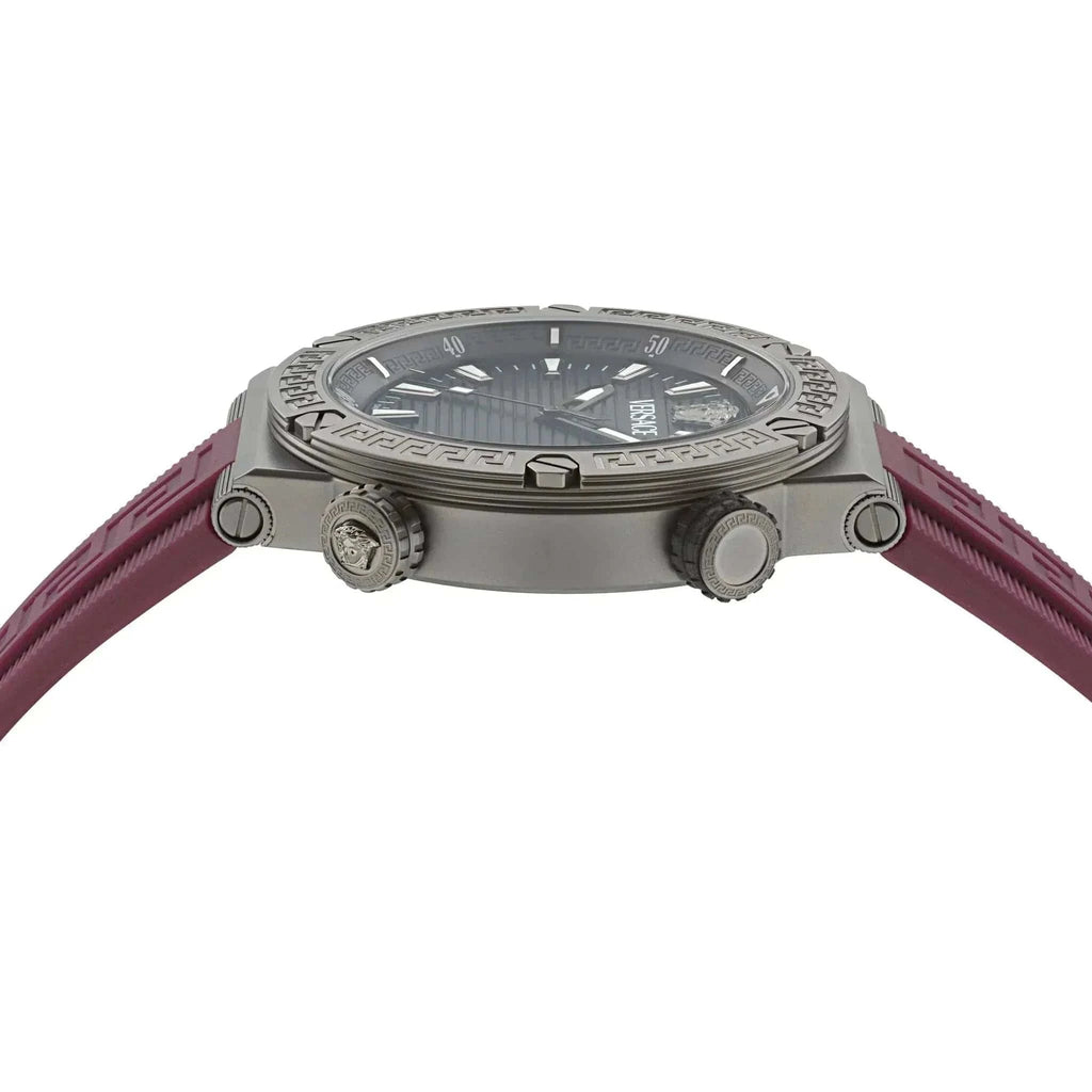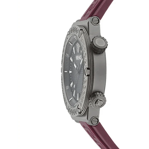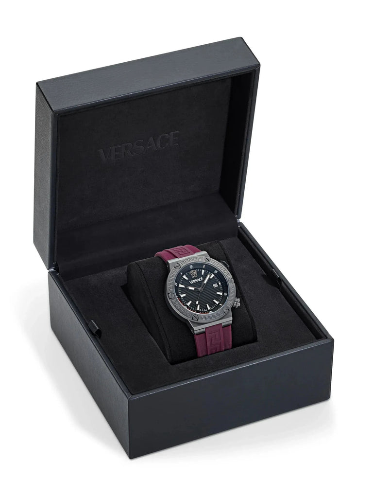 Elevate your style with the Versace Greca Logo Diver, featuring a striking black dial accented by a bold purple rubber strap for durable comfort. This quartz watch for men combines precision with iconic Versace design elements, making it perfect for everyday wear or special occasions. Its durable construction and eye-catching Greca logo bezel ensure you stand out while enjoying reliable timekeeping. Experience luxury and performance in one statement piece.