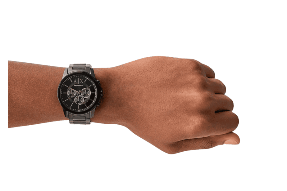 Elevate your style with the sleek and sophisticated Armani Exchange Banks Chronograph watch. This watch features a striking black dial and a durable black steel strap that exudes confidence and elegance. With its precise chronograph function, you'll stay on top of your schedule while making a fashion statement. Make a statement with this timeless timepiece!