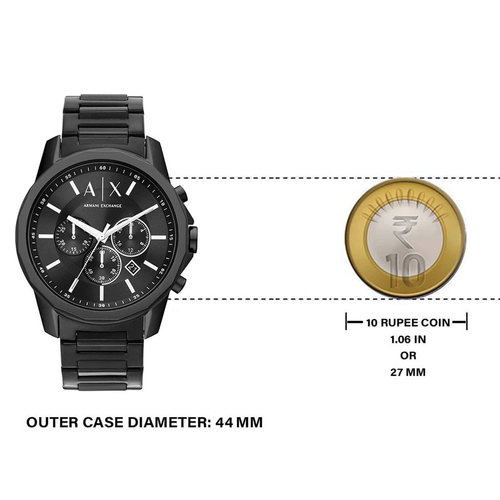 Armani Exchange's 44mm watch features a black cd texture and sunray dial with silver stick indexes, chronograph movement and black-tone stainless steel bracelet.
