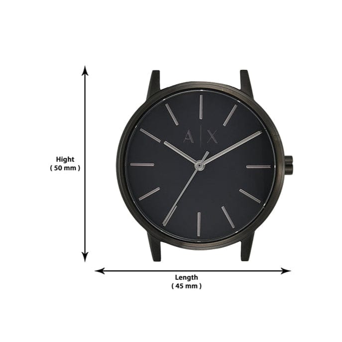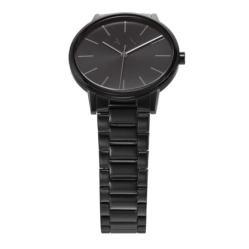 Black PVD stainless steel case and bracelet. Fixed black PVD bezel. Black dial with black hands and index hour markers. The Armani Exchange logo appears below the 12 o'clock position. Dial Type: Analog. Quartz movement. Scratch resistant mineral crystal. Solid case back. Round case shape. Case size: 42 mm. Case thickness: 8 mm. Band width: 20 mm. Deployment clasp. Water resistant at 50 meters / 165 feet. Functions: hour, minute, second. Casual watch style. Armani Exchange Cayde Black Dial Men's Watch AX2701.