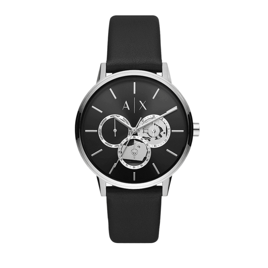Elevate your style with the Armani Exchange Cayde Chronograph Watch for Men. This sleek timepiece features a black leather strap and black dial for a modern, masculine look. With its reliable chronograph function, you'll always be on time while exuding sophistication and confidence. Upgrade your accessory game today!