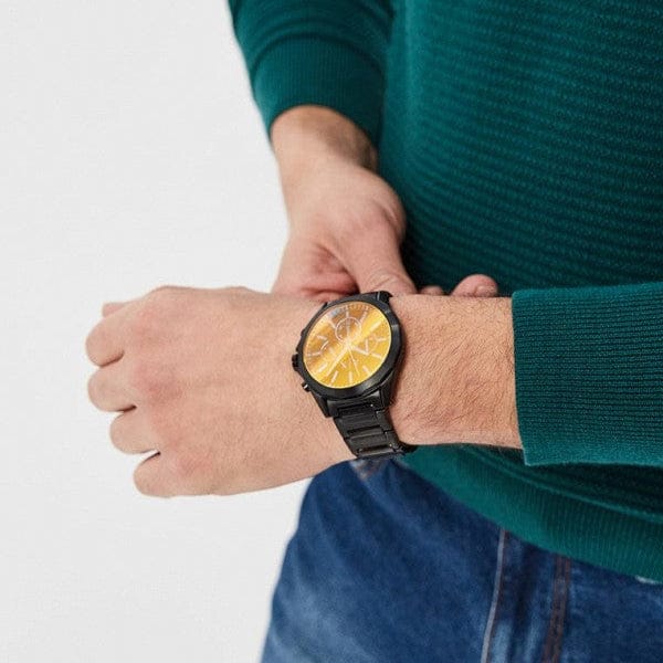 Looking for something classy and urban? Then, the Armani Exchange men's watch would be the perfect choice for you. Featuring a black combo dial, three sub-dials, three hand movements, a date window and three gold crowns on its side. This piece is surely a class apart with vertical lines that dissect the dial. The H-link bracelet is made of top quality stainless steel that is polished to perfection. Most of this watch is encased in a steel case.
