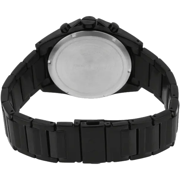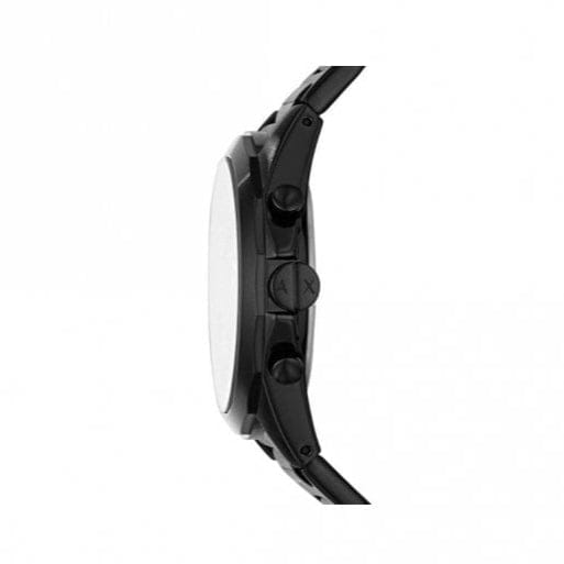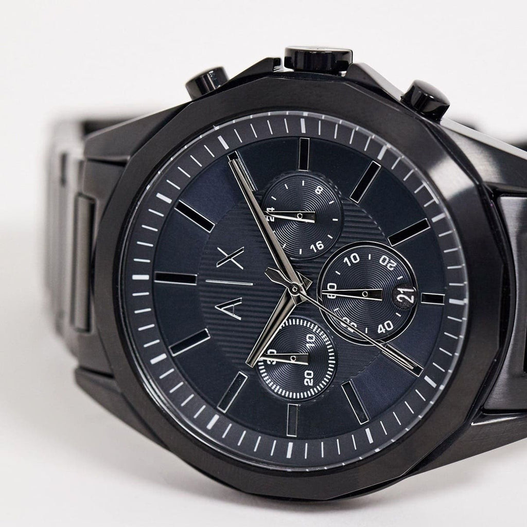 Armani Exchange's 42mm watch features a black sunray dial, chronograph movement and black stainless steel bracelet.