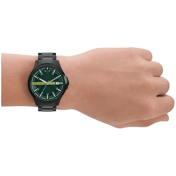 Discover the modern and stylish 46 mm watch by Armani Exchange. Its distinctive cd finish and matte, textured dial create a unique and attractive aesthetic. The stainless steel bracelet complements the watch's overall look while the three-hand date movement ensures accurate timekeeping.