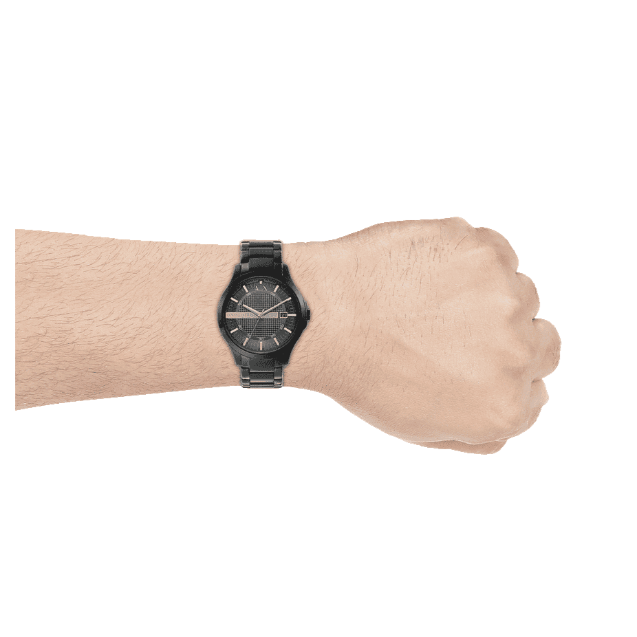 Bold and versatile. This Armani Exchange watch includes a sporty black stainless steel bracelet with a matching black stainless steel case. The 46mm round face features a black dial with date window and three-hand quartz movement. Easily transition from work to weekend with this go-anywhere timepiece.