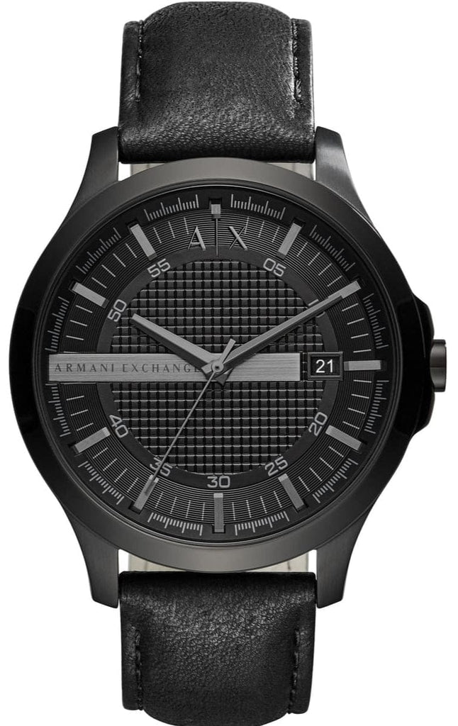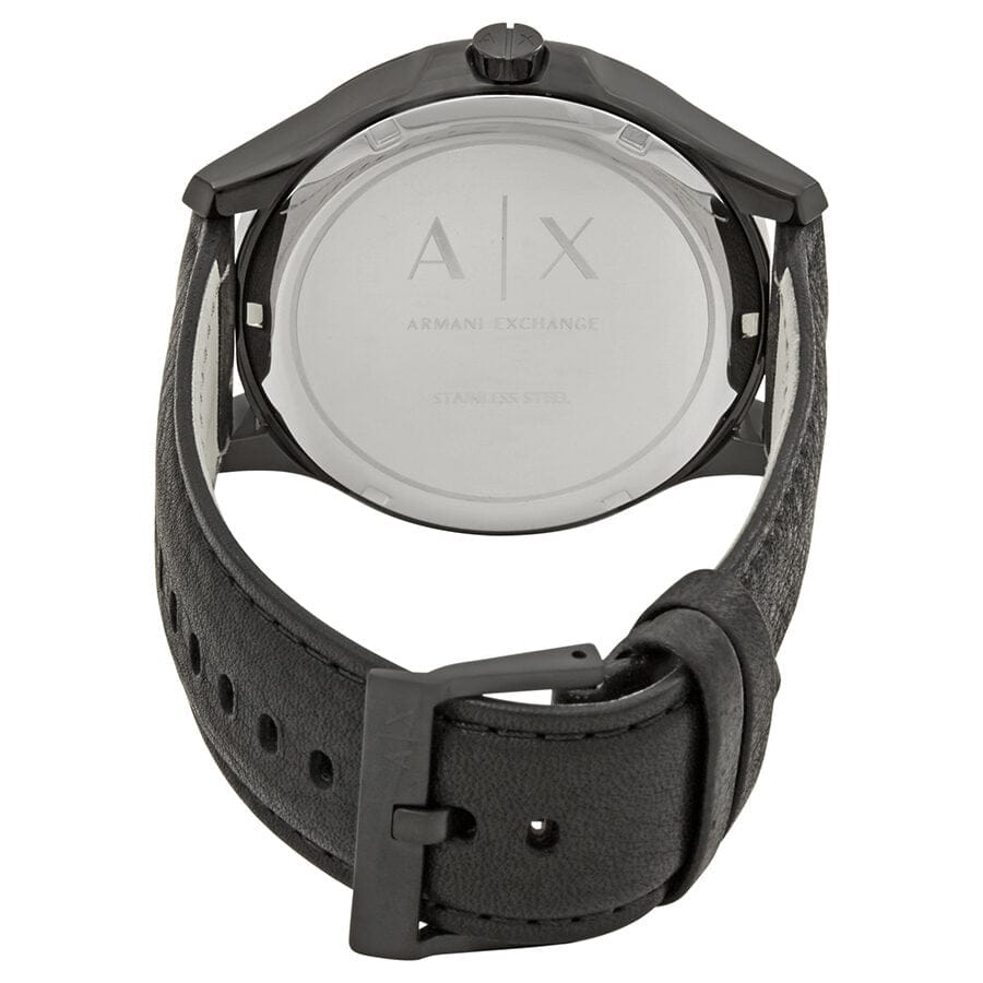 Black ion-plated stainless steel case with a black leather strap. Fixed black ion-plated bezel. Black dial with grey hands and index hour markers. Minute markers around the outer rim. The A|X Armani Exchange logo appears at the 12 o'clock positions. Dial Type: Analog. Date display at the 3 o'clock position.