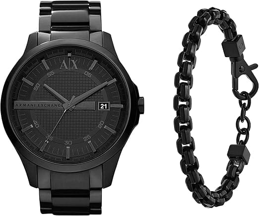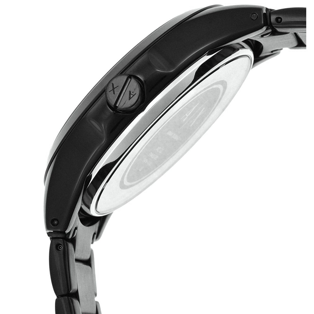 Black ion-plated stainless steel case and bracelet. Fixed black ion-plated bezel. Black dial with black hands and index hour markers. Minute markers around the rim. The Armani AX Exchange logo appears at the 12 o'clock position. Dial Type: Analog. Date display at the 3 o'clock position. Quartz movement.