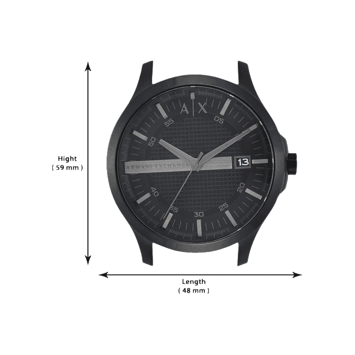 Scratch resistant mineral crystal. Pull / push crown. Solid case back. Case diameter: 46 mm. Case thickness: 10.9 mm. Round case shape. Bracelet width: 22 mm. Deployment clasp. Water resistant at 50 meters / 165 feet. Functions: date, hour, minute, second. Casual watch style. Armani Exchange Hampton Black Dial Black Ion-plated Men's Watch AX2104.