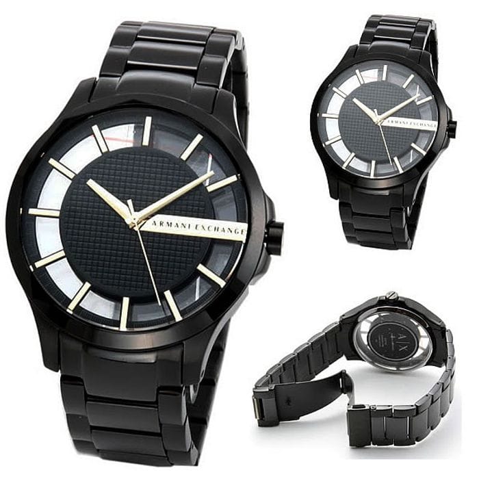Black ion-plated stainless steel case with a black ion-plated stainless steel bracelet. Fixed black ion-plated bezel. Black dial (with transparent outer rim) with gold-tone hands and index hour markers. Dial Type: Analog. Quartz movement. Scratch resistant mineral crystal.