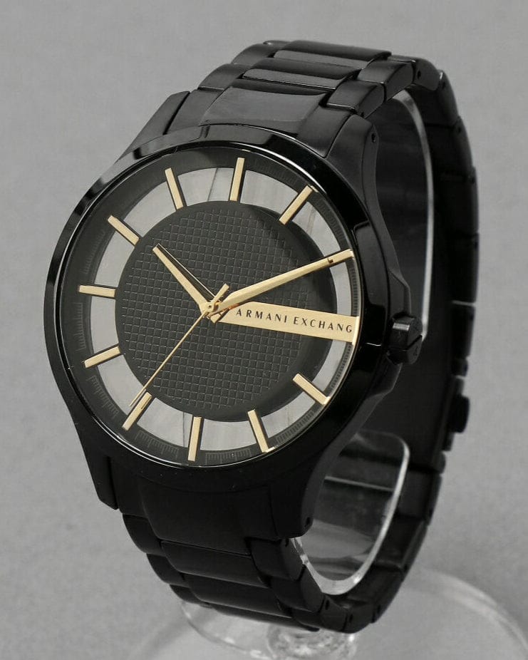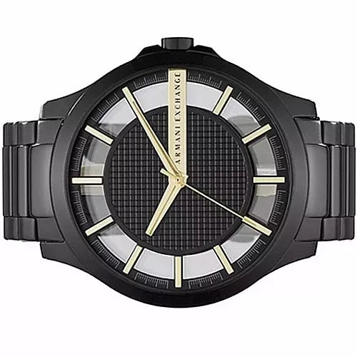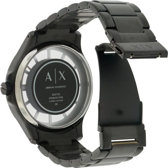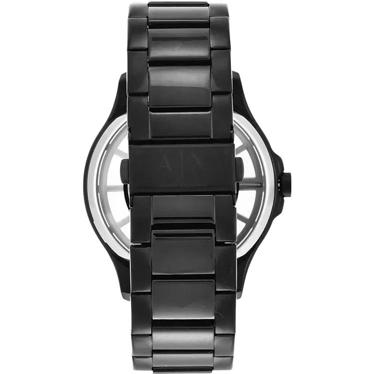 Pull / push crown. Solid case back. Case size: 46 mm. Case thickness: 12 mm. Round case shape. Band width: 22 mm. Fold over with safety release clasp. Water resistant at 50 meters / 165 feet. Functions: hour, minute, second. Casual watch style. Armani Exchange Hampton Black Dial Men's Watch AX2192.