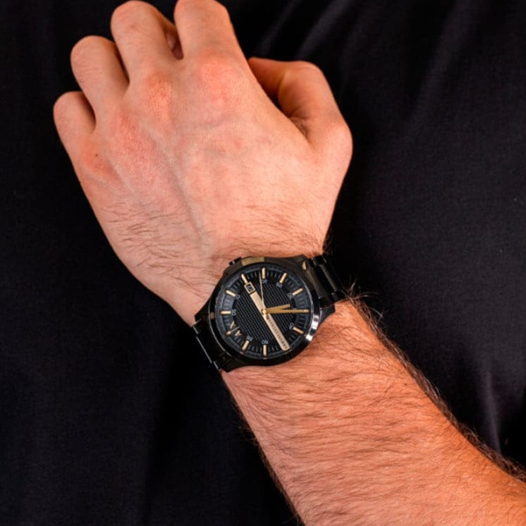 This stylish Armani Exchange watch features a textured black dial, making it a sophisticated addition to any outfit. With its reliable timekeeping and sleek design, it's the perfect choice for the modern man. Made with high-quality materials, it will last for years to come. Elevate your style with the AX2413.
