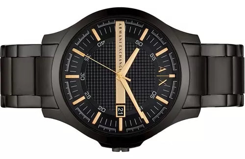 Quartz movement. Scratch resistant mineral crystal. Solid case back. Round case shape. Case size: 46 mm. Case thickness: 11 mm. Band width: 22 mm. Fold over clasp with a safety release. Water resistant at 50 meters / 165 feet. Functions: date, hour, minute, second. Dress watch style. Armani Exchange Quartz Black Dial Men's Watch AX2413.