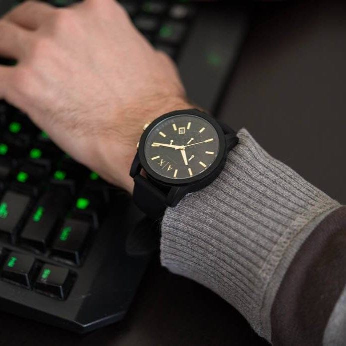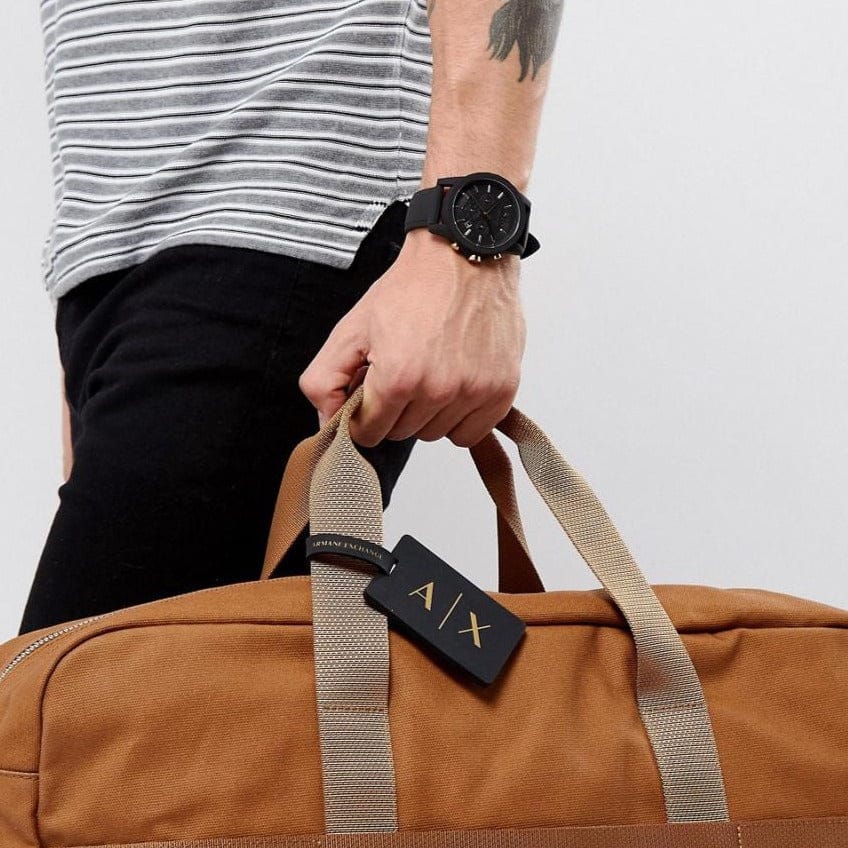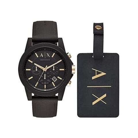 Enhancing its allure, this luxurious timepiece comes as part of an exclusive gift set, accompanied by a matching black silicone luggage tag. Adorned with a striking gold Armani logo, this added accessory elevates the set, making it a perfect gift for yourself or a loved one. Whether you're dressing up for a special occasion or adding a touch of elegance to your everyday attire, the Armani Black Silicone Band Watch AX7105 is the ultimate statement piece. Elevate your look with a watch that reflects refined taste and a profound appreciation for quality