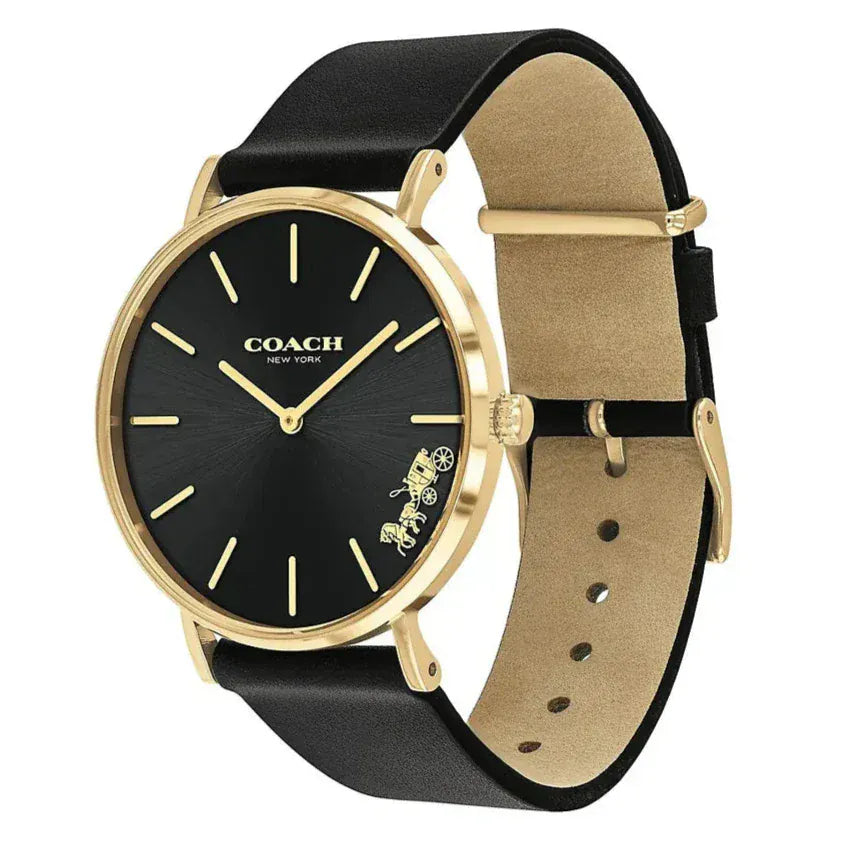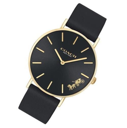 Named for a quiet street in New York City’s West Village, the Perry is a traditional round watch perfect for every day. The gold tone design is finished with a black leather strap and the iconic Coach Horse and Carriage on the dial.