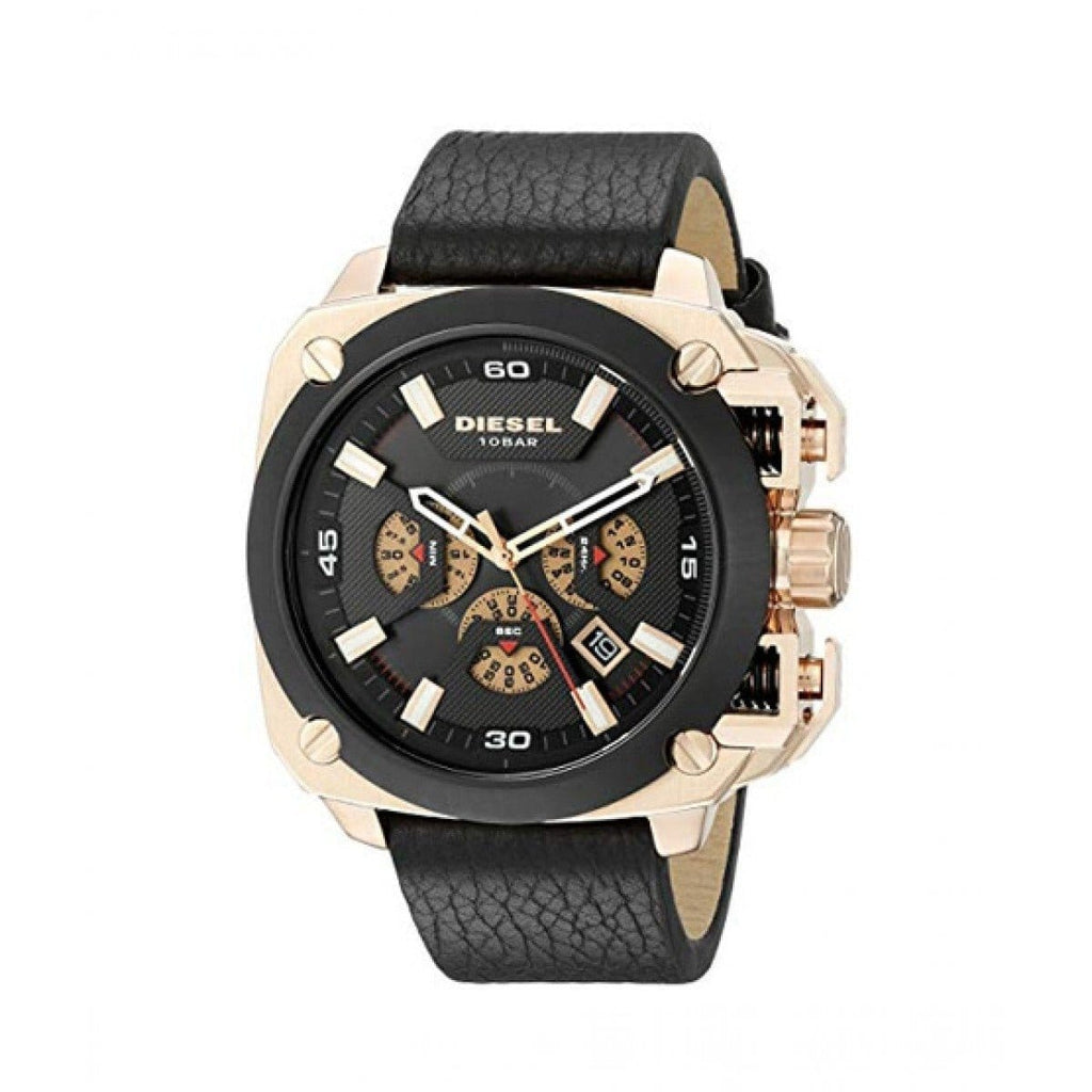 Rose gold-tone stainless steel case with a black leather strap. Fixed black ion-plated bezel. Black dial with rose gold-tone skeleton hands and index hour markers. Minute markers around the outer rim. Dial Type: Analog. Luminescent hands and markers. Date display between 4 and 5 o'clock positions. Chronograph - three sub-dials displaying: 60 second, 30 minute and 24 hour. Quartz movement. Scratch resistant mineral crystal. Solid case back. Case dimensions: 55.5 mm x 57.5 mm. Case thickness: 13 mm. Square case shape. Band width: 26 mm. Tang clasp. Water resistant at 100 meters / 330 feet. Functions: chronograph, date, hour, minute, second. Casual watch style. Diesel BAMF Chronograph Black Dial Black Leather Mens Watch DZ7346.