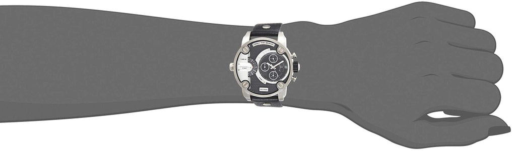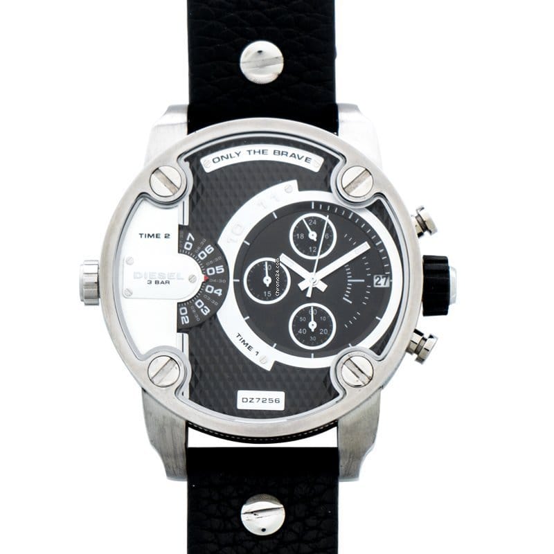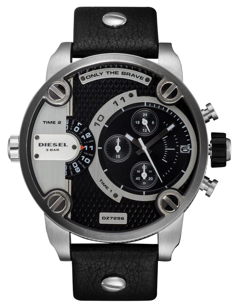 This Diesel Daddy DZ7256 comes in stainless steel case with a black leather strap. Fixed stainless steel bezel. Black and grey (dual time zone) dial with silver-toned hands. Minute markers around the outer rim. Dial Type: Analog. Date display at the 3 o'clock position. Chronograph - three sub-dials displaying: 60 second, 30 minute and 24 hour. Quartz movement. Scratch resistant mineral crystal. Pull / push crown. Solid case back. Case dimensions: 61 mm x 51 mm. Case thickness: 13 mm. Round case shape. Band width: 24 mm. Band length: 8.5 inches. Tang clasp. Water resistant at 30 meters / 100 feet. Functions: chronograph, date, hour, minute, second. Sport watch style.