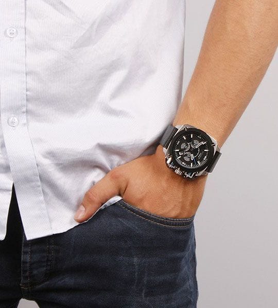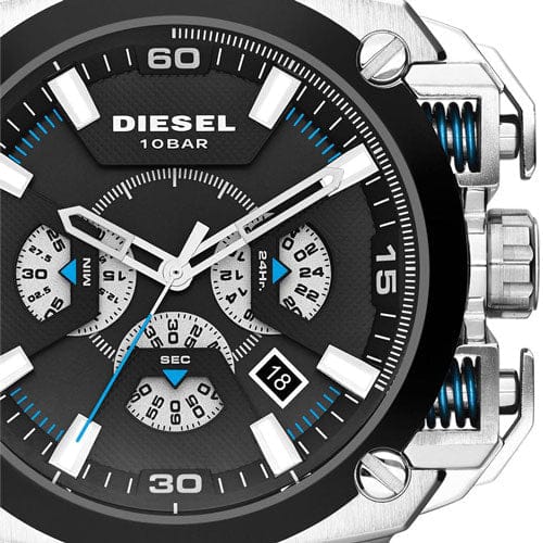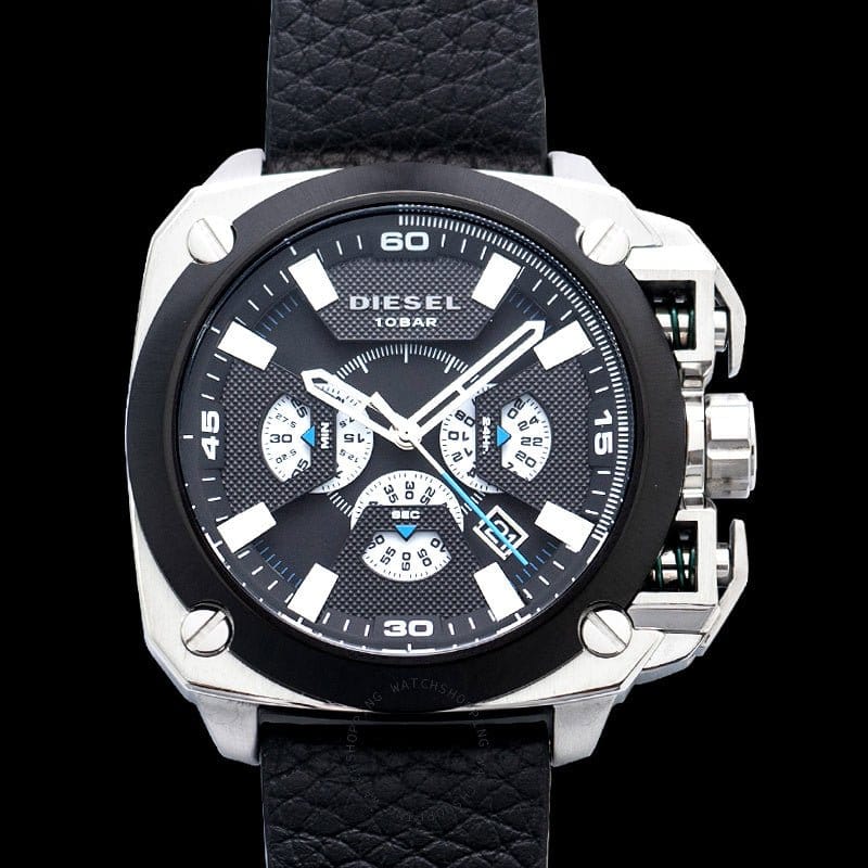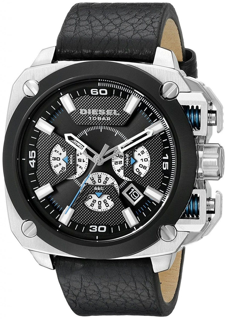 Stainless steel case with a black leather strap. Fixed black ion-plated bezel. Black dial with silver-toned skeleton hands and index hour markers. Minute markers around the outer rim. Dial Type: Analog. Date display between the 4 and 5 o'clock positions. Chronograph - three sub-dials displaying: 60 second, 30 minute and 24 hour. Quartz movement. Scratch resistant mineral crystal. Solid case back. Case diMen'sions: 55.5 mm x 57.5 mm. Case thickness: 13. mm. Square case shape. Band width: 26 mm. Tang clasp. Water resistant at 100 meters / 330 feet. Functions: chronograph, date, hour, minute, second. Casual watch style. Diesel BAMF Chronograph Black Dial Black Leather Men's Watch DZ7345.