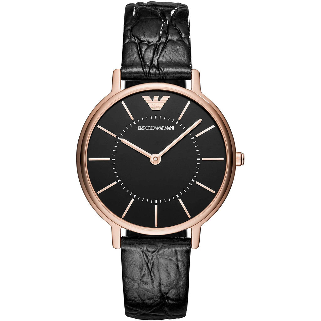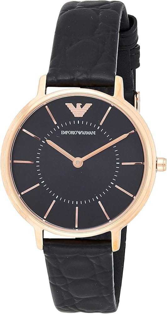 Emporio Armani Kappa AR11047 is a very beautiful and classically designed women's watch with a soft calfskin leather strap from Armani. The watch has a fine watch case of 32mm in diameter and 7mm thickness. The case and bezel are gold-coloured, and the crown has a discreet Armani logo engraved. The Black leather strap has a gold buckle with logo, and measures 14mm in width.