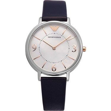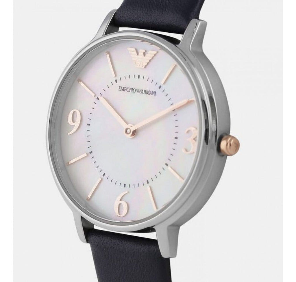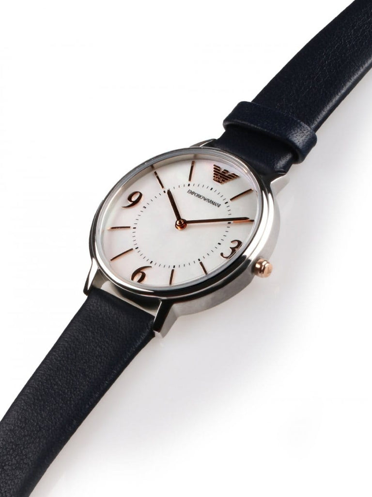 Emporio Armani Women's Watch. This Model Has 32m Dimension Case And Made Of Stainless Steel With Mixed Silver Finish / Steel And Round Shape Finish. The Case Has 6m Thickness, The Glass Is Transparent, The Dial Color Is Mother Of Pearl, White And The Stainless Steel Stainless Steel With Silver And Stainless Steel Shiny And Satin Finish. The Distance Of The Bent Of This Clock Is Of 14 Mm. The Strap Is Skin And Is Blue Color. Water Resistance Is At 3 Atm. Clock Type And Movement: Quartz / 2 Hands. The Reference Is Ar2509