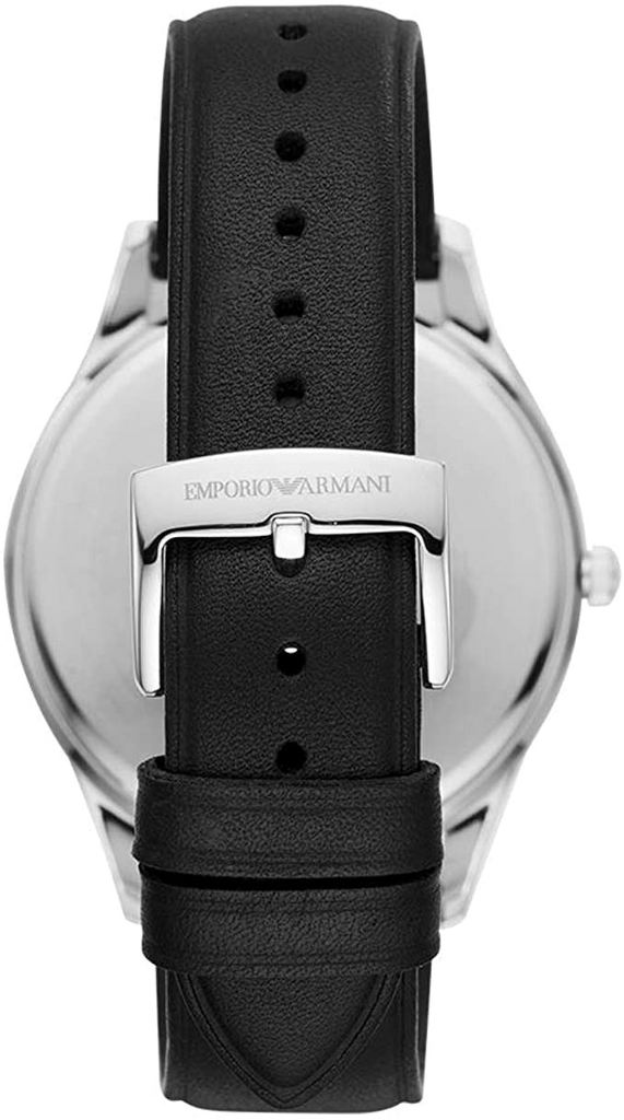 The Emporio Armani AR11162 is a sporty, modern watch in black and silver that matches your style. Emporio Armani 's Modern Slim watch has a clean and sophisticated design that will complement any look. This men's watch features a black 42mm stainless steel case, mineral glass and a black leather strap.