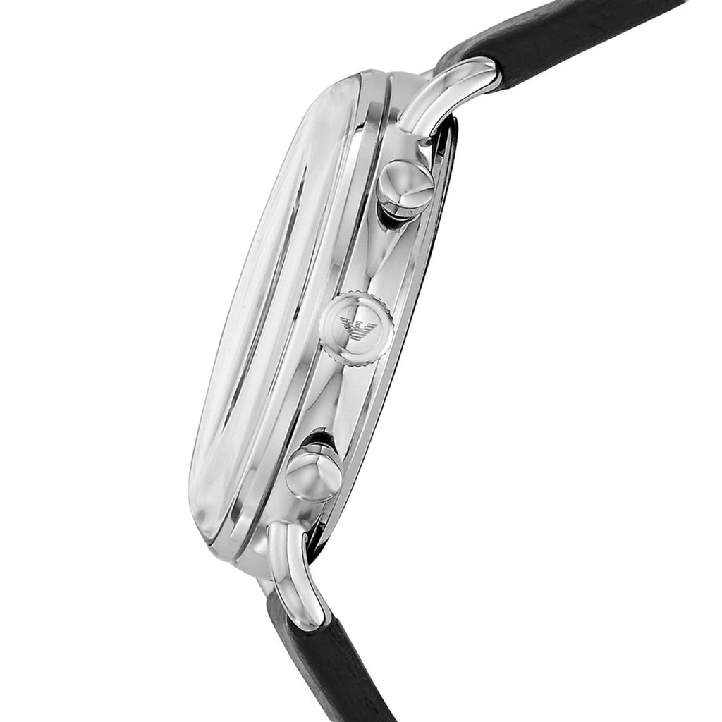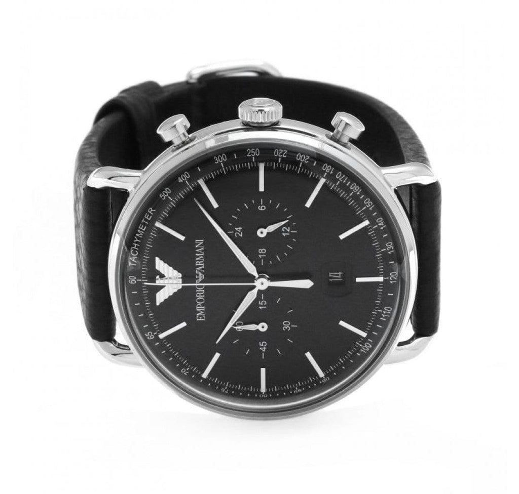 Silver-tone stainless steel case with a black leather strap. Fixed silver-tone stainless steel bezel. Black dial with luminous silver-tone lance-style shape hands and index hour markers. Minute markers. tachymeter markings around the outer rim. Dial Type: Analog. Luminescent hands. Date display above the 6 o'clock position. Chronograph - two sub-dials displaying: 60 second and 24 hour. Quartz movement. Scratch resistant mineral crystal. Pull / push crown. Solid case back. Round case shape, case size: 43 mm, case thickness: 12 mm. Band width: 22 mm. Tang clasp. Water resistant at 50 meters / 165 feet. Functions: chronograph, tachymeter, date, hour, minute, second, 24 hour. Pilot watch style. Watch label: Japan Movt. Emporio Armani Aviator Chronograph Quartz Black Dial Men's Watch AR11143.