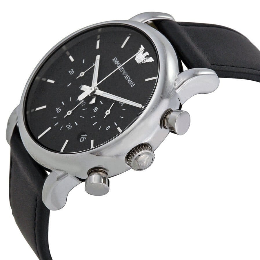 Stainless steel case with a black leather strap. Fixed stainless steel bezel. Black dial with luminous silver-tone hands and index hour markers. The Emporio Armani logo appears at the 12 o'clock position. Dial Type: Analog. Luminescent hands and markers. Date display between the 4 and 5 o'clock positions. Chronograph - three sub-dials displaying: 60 seconds, 60 minutes, and 24 hours. Quartz movement. Scratch-resistant mineral crystal. Pull/push crown. Solid case back. Round case shape, case size: 41 mm, case thickness: 12 mm. Band width: 20 mm. Tang clasp. Water-resistant at 50 meters / 165 feet. Functions: chronograph, date, hour, minute, second. Dress watch style. Emporio Armani Classic Chronograph Black Dial Men's Watch AR1733.
