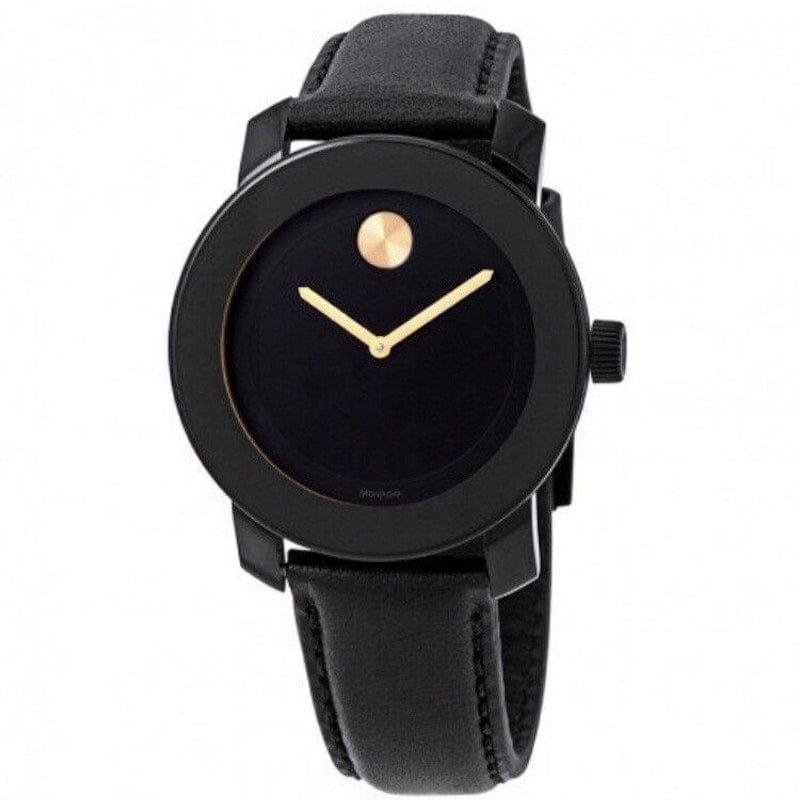 Brand New Authentic Movado Bold Black Dial Black Leather Strap Unisex Watch Model 3600527. Stainless Steel case with Black Leather strap. Tang clasp. Fixed bezel. Dial description: Yellow Gold Tone Hands and Signature Movado Dot Marking the 12 o'clock position on a Black dial. Black dial. Battery Operated Quartz movement. Watch functions: Hour, Minute. Round case shape. Case size: 36mm. Solid case back. 30 Meters - 100 Feet water resistant. 2 year warranty.