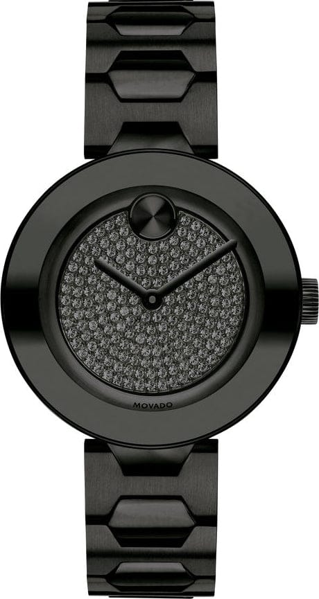 Brand New Authentic Movado Bold Black Steel Crystal Women's Fashion Watch Model 3600576. Stainless Steel Polished case with Black Stainless Steel watch band. Hidden Deployment clasp. Black dial. Battery Operated Quartz movement. Scratch Resistant Sapphire crystal. Round case shape. Case size: 32mm. Solid case back. 30 Meters - 100 Feet water resistant. 2 year warranty.