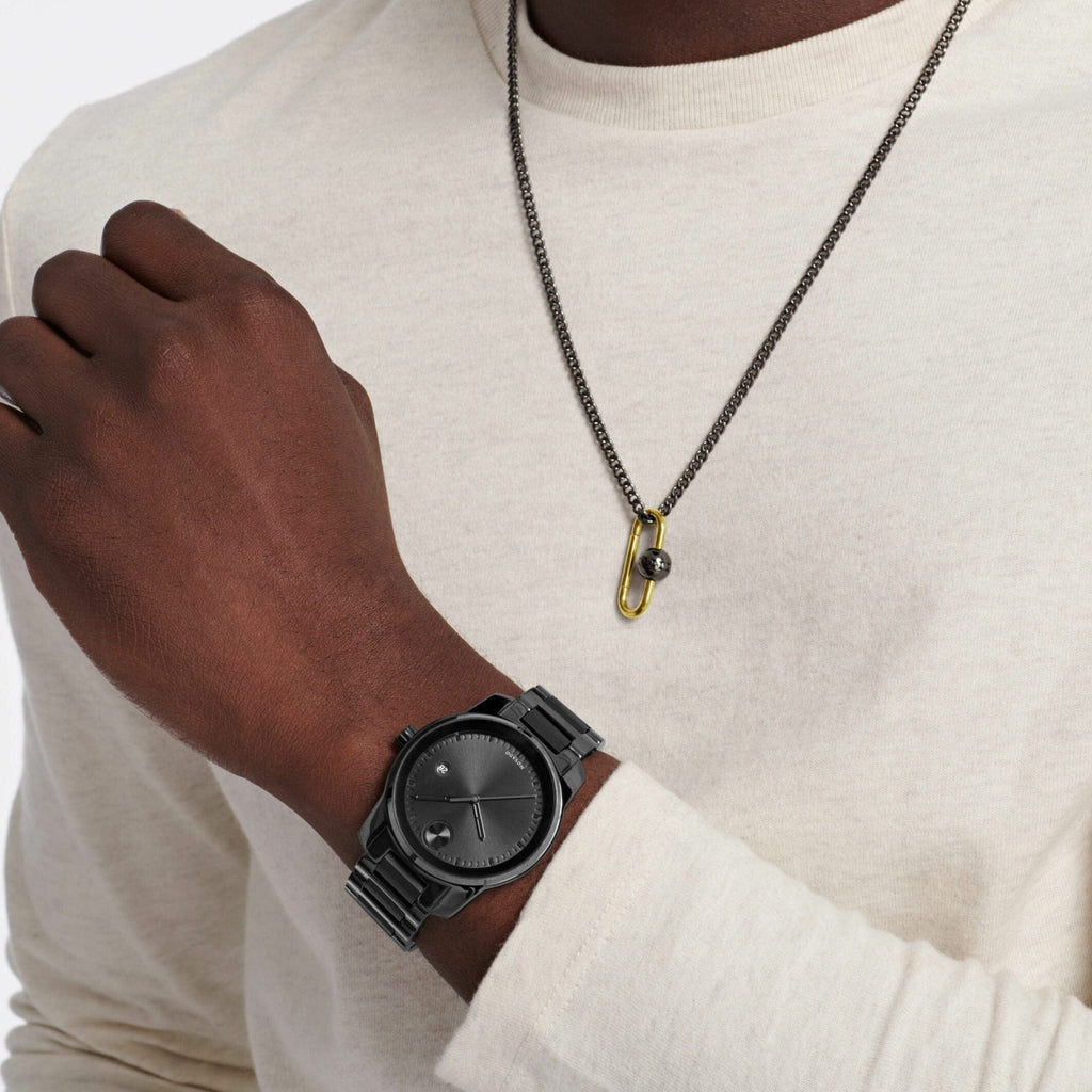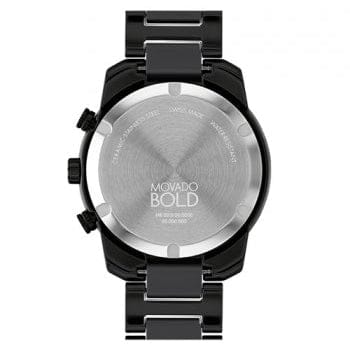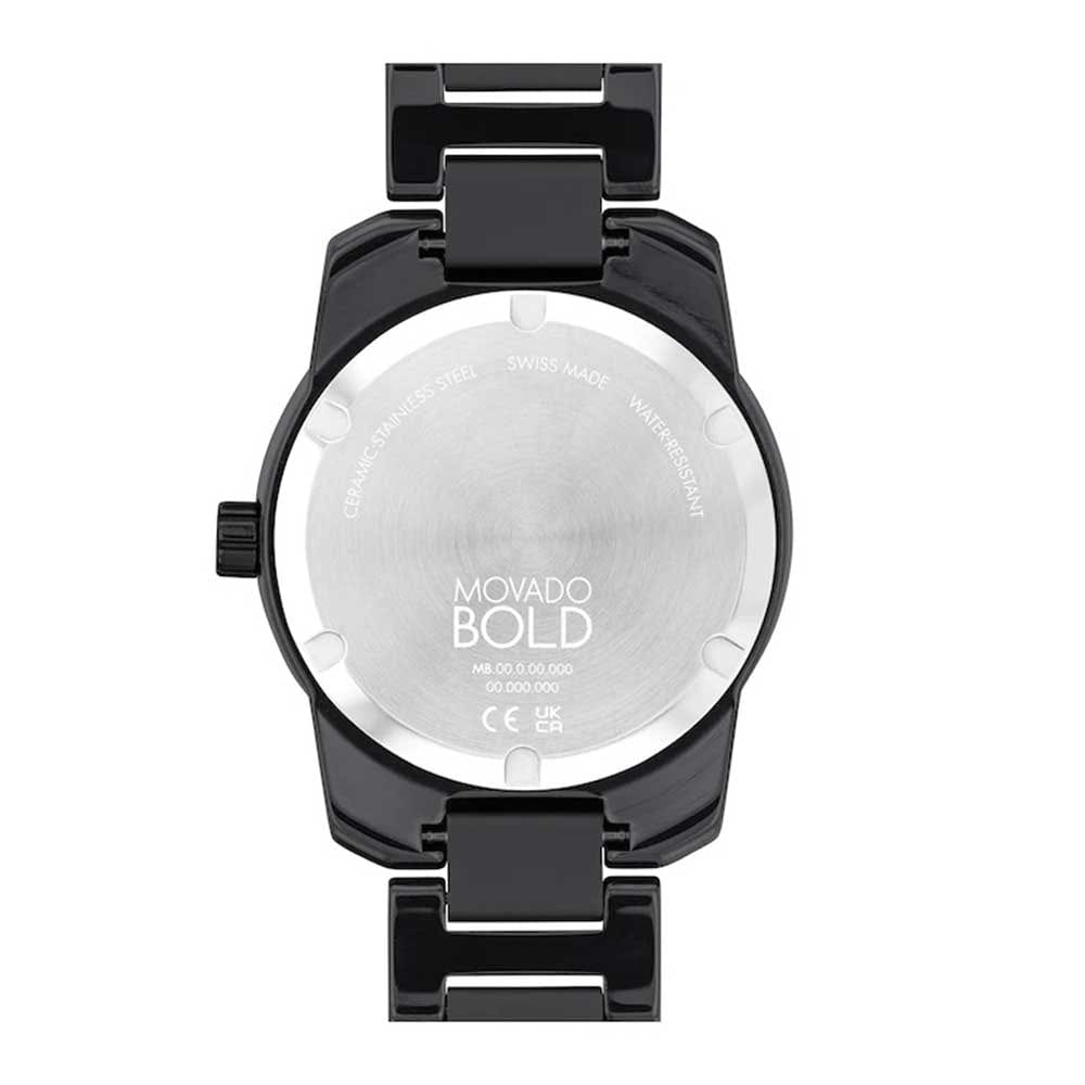 Men's Movado BOLD Black Verso Swiss watch, black dial with Super-Lumi Nova accents, black ceramic and gunmetal ion-plated stainless-steel case on a black ceramic bracelet, window at 3 O'clock position, K1 mineral crystal, water resistant to 5 ATM, case size 42mm.