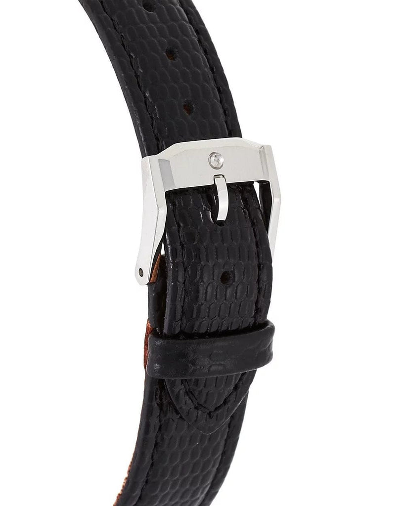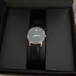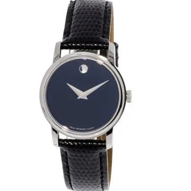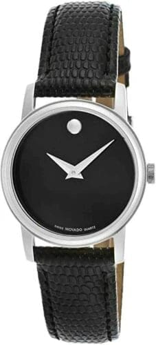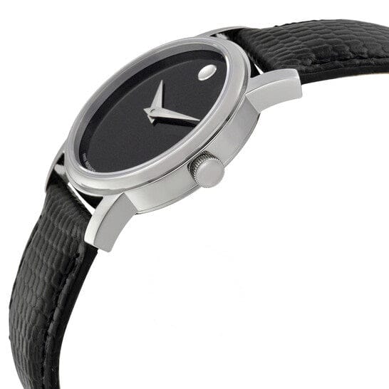 Case thickness: 7 mm. Round case shape. Bracelet width: 15 mm. Tang clasp. Water resistant at 30 meters / 100 feet. Functions: hours, minutes. Dress watch style. Watch label: Swiss Made. Movado Museum Black Dial Black Leather Strap Ladies Watch