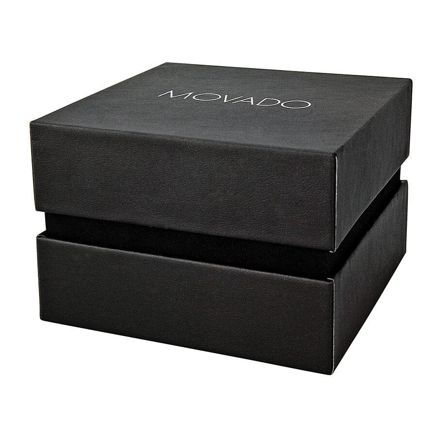 Silver-tone stainless steel case with a black leather strap. Fixed silver-tone stainless steel bezel. Black dial with silver-tone dauphine-style shape hands and the signature Movado dot appears at the 12 o’clock position. No markers. Dial Type: Analog. Quartz movement. Scratch resistant sapphire crystal.