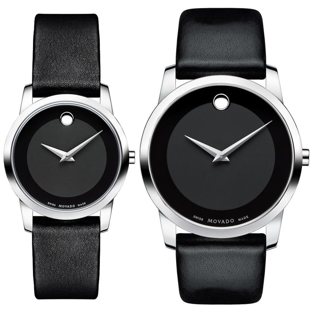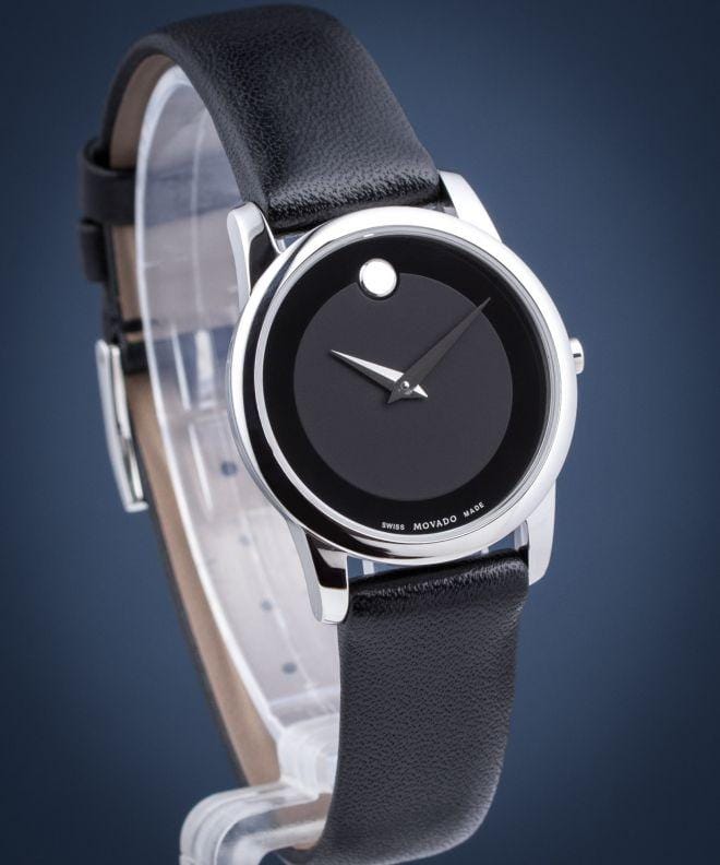 Pull / push crown. Solid case back. Round case shape, case size: 28 mm, case thickness: 6.5 mm. Band width: 14.9 mm. Tang clasp. Water resistant at 30 meters / 100 feet. Functions: hours, minutes. Dress watch style. Watch label: Swiss Made. Movado Museum Black Dial Black Leather Ladies Watch 0606503.
