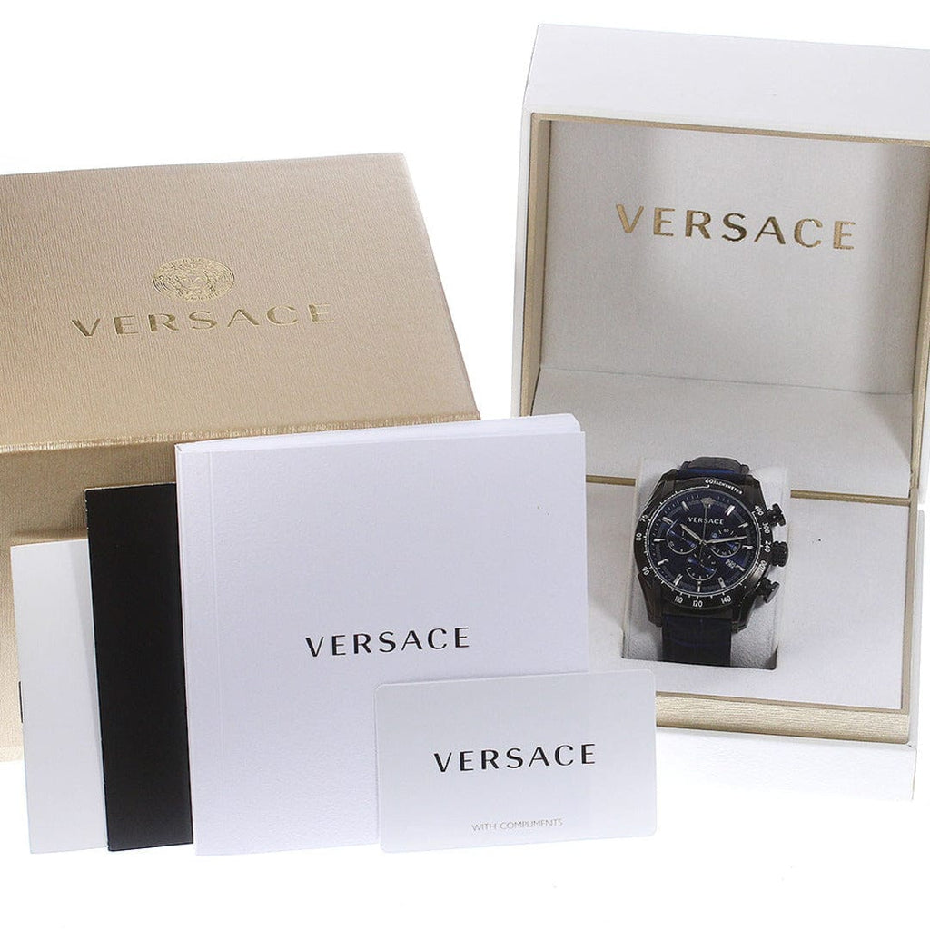 Versace V-Ray Chronograph Quartz Blue Dial Black Leather Strap Watch For Men - VEDB00418