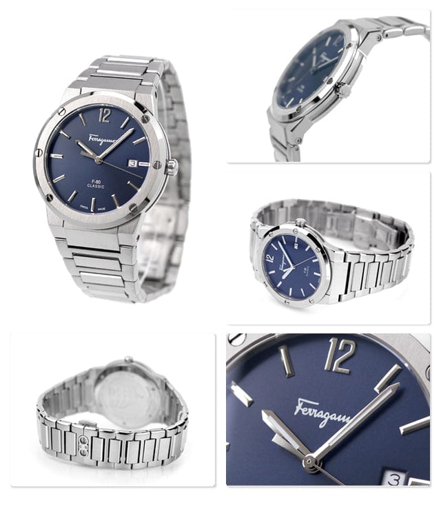 Round case shape, case size: 41 mm. Deployment with push button release clasp. Water resistant at 50 meters / 165 feet. Functions: date, hour, minute, second. F-80 Classic Series. Dress watch style. Watch label: Swiss Made. Salvatore Ferragamo F-80 Classic Quartz Blue Dial Men's Watch SFDT01320.