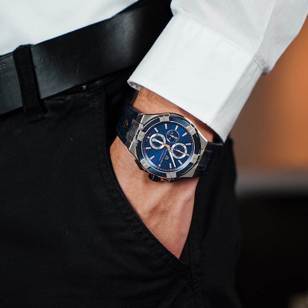 The Maurice Lacroix Chronograph AI1018-SS001-432-4 has a stainless steel case with a lunette in blue PVD finish, which is complemented by a blue calfskin strap. Inside it, the Ronda 3540.D Swiss battery-powered movement with five jewels ticks reliably. In addition to the date display, which can be found at the six o'clock index, the watch also features a stopwatch function with the ability to measure up to 30 minutes.