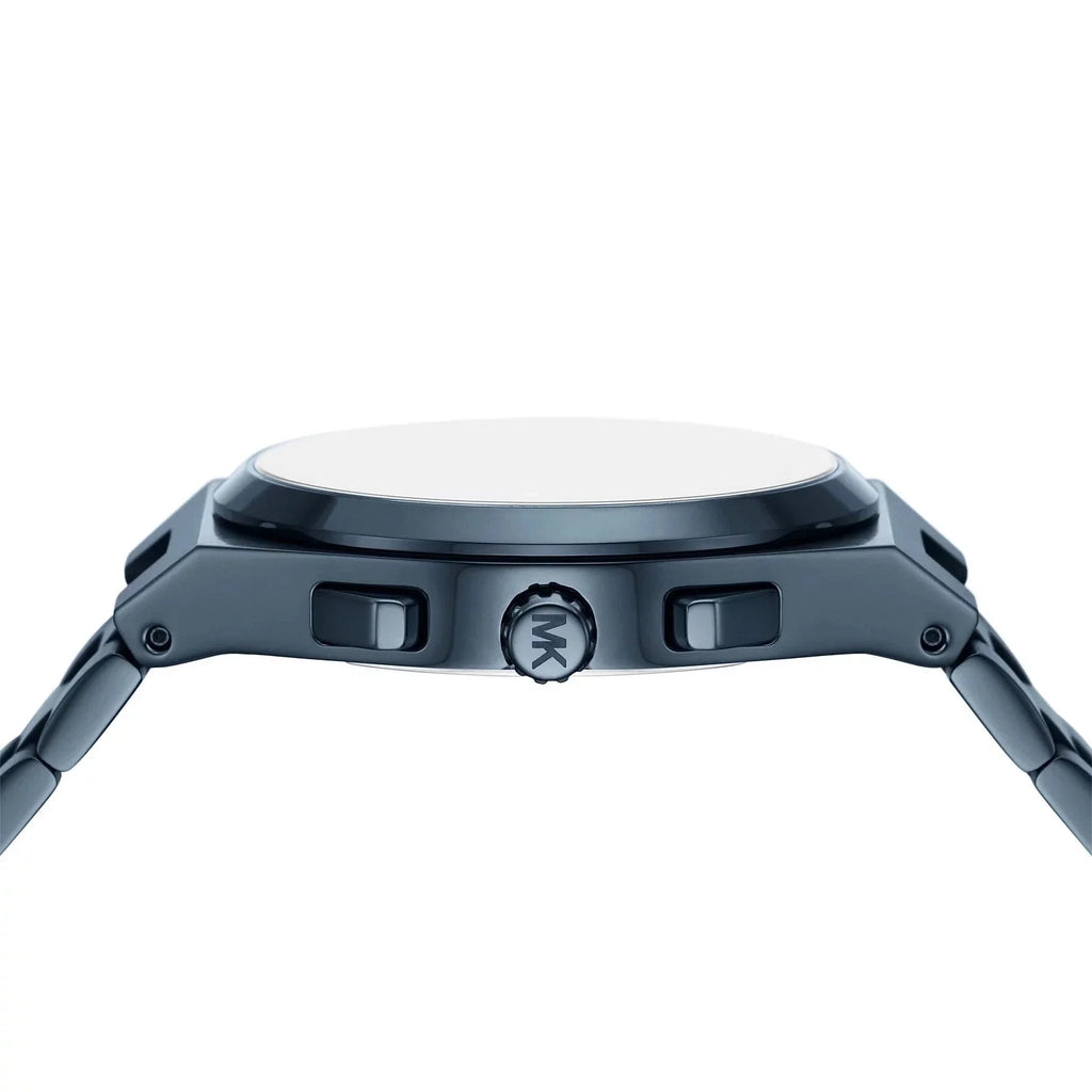 Michael Kors' 40mm Lennox watch features a blue textured dial, chronograph movement and blue stainless steel bracelet.