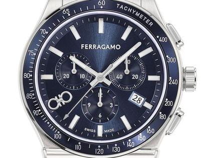 The 1927 Chrono 40mm combines impeccable Swiss watchmaking with Ferragamo's penchant for classic designs. Merging refined aesthetic with precise timekeeping, the model offers a polished stainless steel construction and traditional round face, equipped with three chronograph counters and a tachymeter scale.